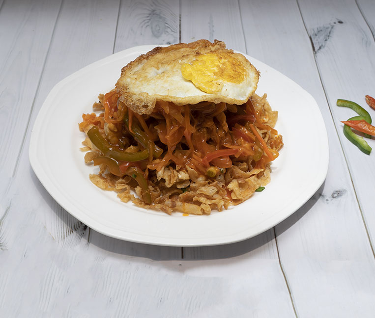 American chop suey featuring irresistible sweet and spicy sauce served on a bed of crispy noodles. Loaded with vegetables and touch of protein. The chicken version of the chopsuey comes with a fried egg in top with boiled chicken strips